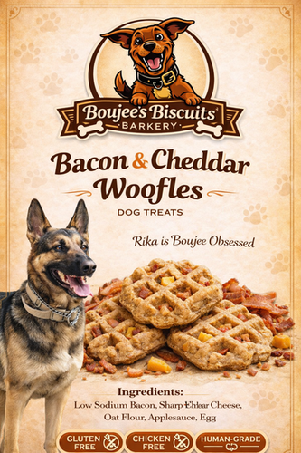Introducing our most popular release to date: Bacon & Cheddar Woofles. Made with low-sodium thick slab smoked bacon, sharp cheddar, oat flour, egg, and applesauce, these mini waffles are crafted in a waffle iron and then dehydrated to ensure maximum freshness and flavor. Perfectly suited for our discerning canine customers, these treats are so delicious that many of our humans have reported eating them too. At Boujee, we pride ourselves on creating gourmet dog treats with the highest-quality that both pets and their owners can appreciate. Treat your furry friend to a taste sensation they won’t forget!