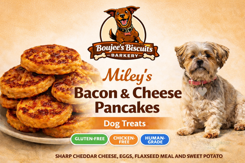 M ashed sweet potato, hickory low sodium bacon, cheddar cheese, eggs and flax seed meal made into small tasty mini- pancakes for your pup.