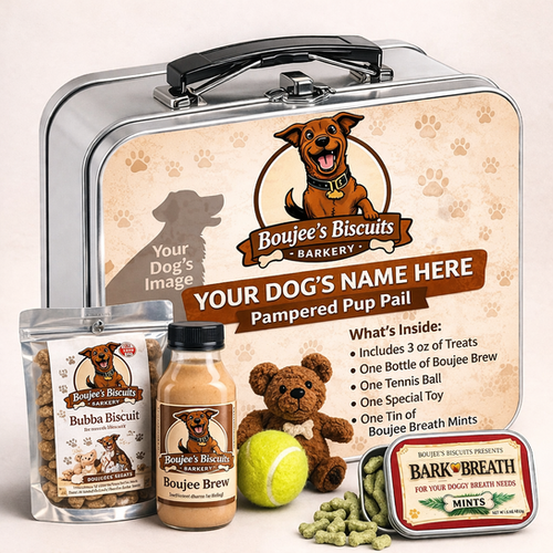 🐾 Pampered Pup Pail By Boujee’s Biscuits Barkery Treat your pup like the VIP they are 💅🐶Our Pampered Pup Pail is the ultimate all-in-one goodie box made for spoiled, loved, and totally boujee dogs. Perfect for gifts, gotcha days, birthdays, or just because your dog deserves it.🎒 What’s Inside:🦴 3 oz of Boujee’s Biscuits Treats🍺 Boujee Brew (Dog-Safe Mock Drink)🎾 One Tennis Ball🧸 One Special Toy🌿 Boujee Breath Mints (Tin Included)🐶 Personalized Just for Your Pup Each pail includes a custom label featuring: Your dog’s name Space for your dog’s photo Because basic just isn’t our style 😉💖 Why Pet Parents Love It:✔ Handmade, small-batch treats✔ Unique & gift-ready packaging✔ Perfect mix of treats + fun + wellness✔ Boutique, luxury feel without the fuss🎁 Perfect For: Dog birthdays 🎂Gotcha Days 🐾Holidays & gifts 🎄New puppy welcome kits 🐶Spoiling your best friend (always acceptable)📦 Packaging: Comes in a reusable metal lunch pail — sturdy, stylish, and perfect for storing treats, toys, or keepsakes.⚠️ Notes: Treats are intended for supplemental feeding Always supervise your dog with toys Store treats in a cool, dry place🐾 Boujee’s Promise: Made with love, baked with care, and designed to make tails wag 💕