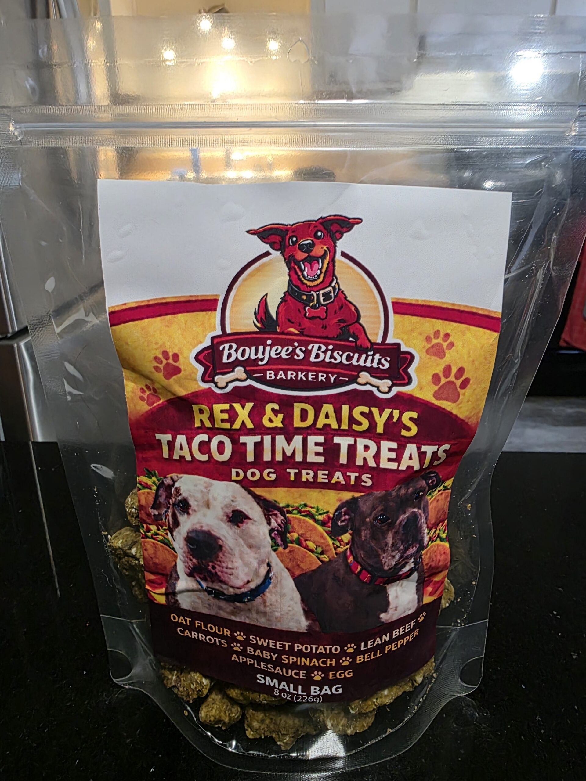 OAT FLOUR, SWEET POTATO, CHEDDAR CHEESE, BEEF, BELL PEPPER, LEAN BEEF, GREEK YOGURT, CARROTS, EGG, SPINACH, wholesome, human-grade baked fresh in small batches. We skip the junk and focus on real food nutrition — hearty beef, creamy cheddar, sweet potato, and colorful veggies blended into crunchy, satisfying biscuits your dog will crave. Perfect for: ✔ Training✔ Rewards✔ Spoiling your best friend✔ Dogs with chicken sensitivities At Boujee’s Biscuits Barkery, we believe treats should be just as clean and delicious as the food we eat. That’s why every bag is baked with care, quality, and love.7 oz. or14 oz resealable bag