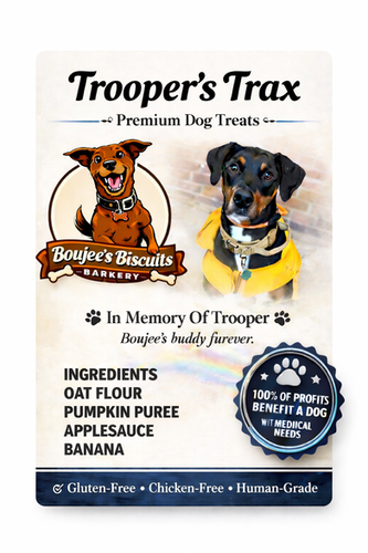 Paw shaped treats made from : Blueberry, pumpkin puree applesauce and oat flour. It is named after our Boujee family member, Trooper. He won the 2024 name your treat contest. He is battling cancer.